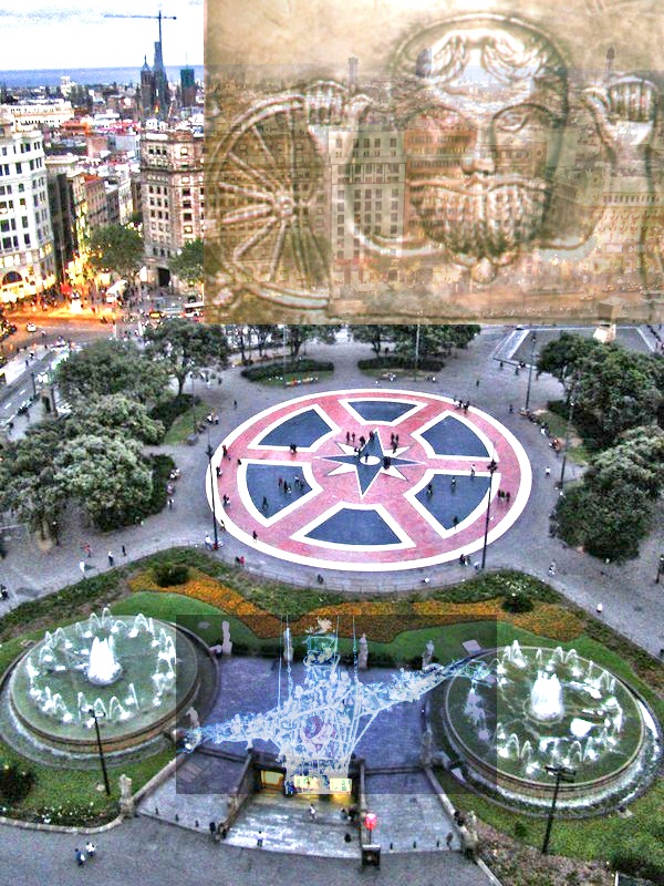 Las fuentes de Montjuïc fueron las escogidas como escenario para magnificar la simbología de los cuatro elementos principales. Bien custodiadas por las dos torres venecianas de la limítrofe Plaza de España, que en anteriores investigaciones pudimos observar que está situada en el lugar destinado al sefirot Kéter, de un más que hipotético, árbol de la cábala diseñado para la ampliación de la ciudad condal un siglo y medio atrás.