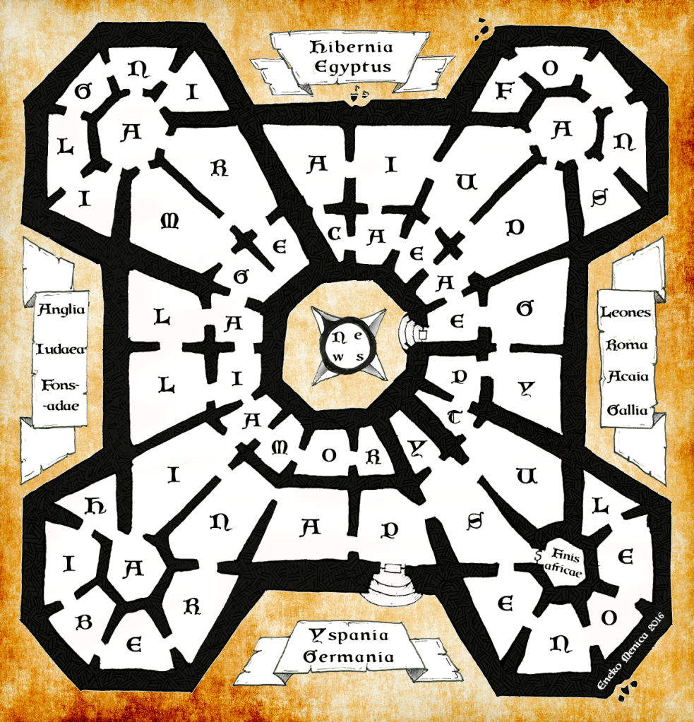 En el momento de superar todas las pruebas para acceder a la cámara secreta del «finis africae», maestro y alumno, pasan a ella con la sorpresa, o no tanto para Baskerville, de encontrarse al cancerbero del libro prohibido con este entre sus ancianas manos. En ese lugar, el narrador, es testigo de una batalla intelectual entre los dos antagonistas de la historia. La figura de dos sabios que entran en un juego de oratoria y retórica en la que una de las partes conoce su destino. La que representa al «toro-minotauro» que ha de ser sacrificado para salir del laberinto, del que ya fueron advertidos por un monje, «si lográis entrar, podríais no salir«. La biblioteca es un laberinto. «Aristóteles» espera encerrado en el laberinto, en el centro, y su custodio, no dejará arrebatarse la sabiduría que corromperá a los humanos, aquella que los puede convertir en «malos salvajes» fuera de la sumisión señorial.