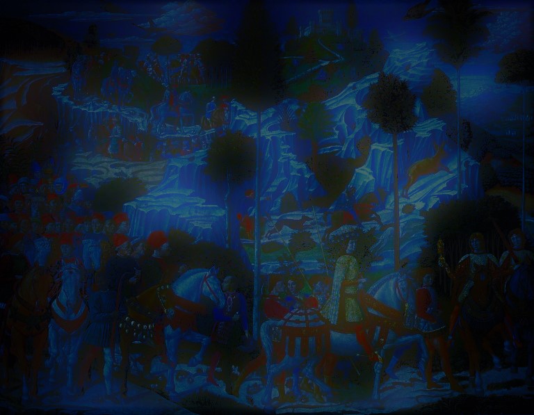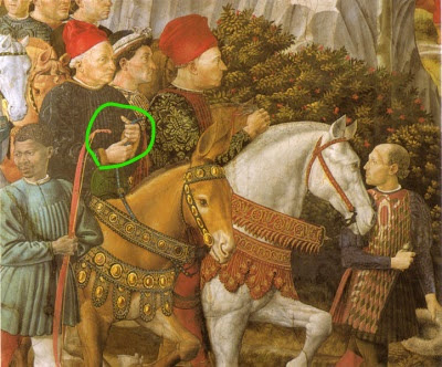 Esta representación parece tener como objetivo identificarse como los vasallos del Emperador de los Cielos, en apariencia, y a la aspiración dinástica al principado universal en la tierra, la parte Occidental y la parte Oriental, en posesión otomana ya en esa fecha. De ahí la procesión hacia la Jerusalén Celestial y como guiño, un cedro, árbol simbólico de eternidad, que conecta la familia Medici a la colina que arriba a los cielos. El rey sabio es el reflejo de Cosimo, el Viejo; el rey maduro la imagen idealizada de Pedro, el hijo gotoso. ¿Y el joven Lorenzo, el nieto? Las posiciones y gestos de las manos de la mayoría de los participantes en el ritual escenificado, así como sus rostros, necesitan de un análisis profundo esotérico para el que no estamos capacitados, de momento. Eso no quiere decir que no veamos cosas extrañas aquí.