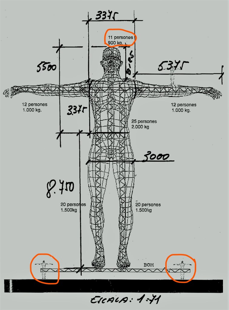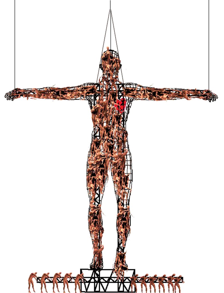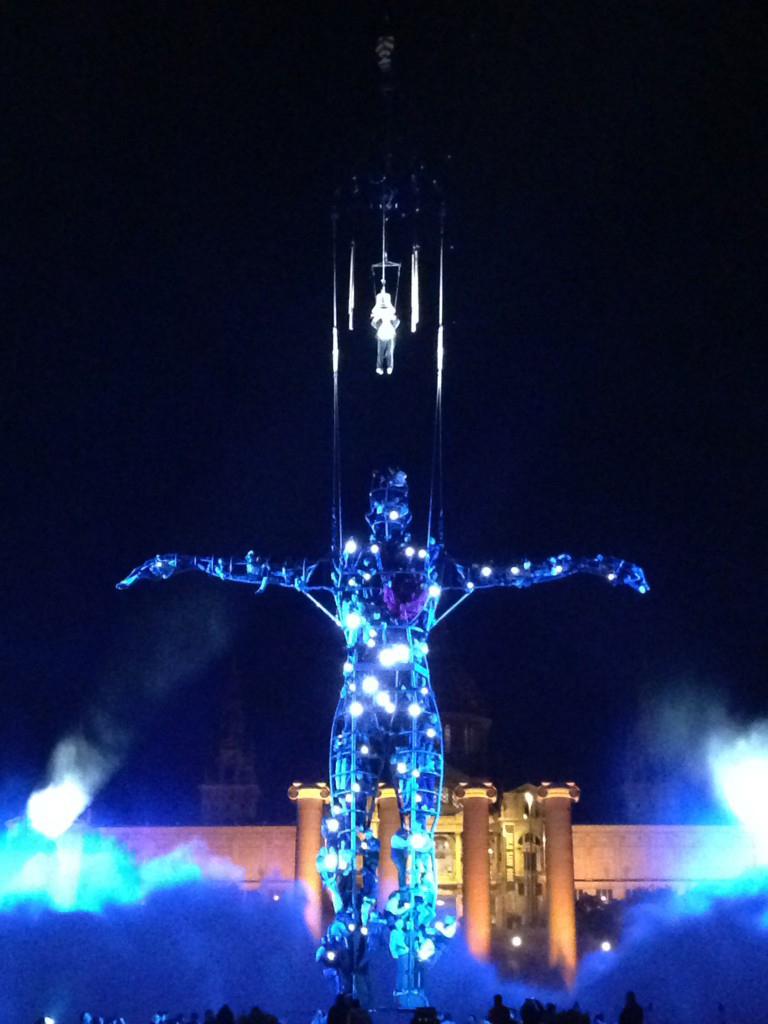 «La idea de una escultura hecha de carne humana, inspirada en los «castellers». Todos hacen uno. Todos unidos hacen fuerza. Con esta torre humana emergiendo de la tierra mirando hacia el agua, que es el origen de la vida e imitan la naturaleza. La criatura viene desde el aire sobre las fuentes. Entonces, los «castellers», suben por la estructura metálica y ocupan todo el interior menos la cabeza y el corazón; porque mientras no tenga corazón no puede funcionar. Se llena el corazón y lo ayudan a latir con las luces de los teléfonos móviles. «¡PAM- pam!, ¡PAM-pam! Suben a la cabeza, ocupada por gente muy joven, personas inocentes. Su mente, la del nuevo ser, es inocente. Comienza a tomar vida y abre los brazos. Gira 360º, convertir la «idea global» de todo el mundo. Luego vienen las 12 campanadas muy poco a poco, porque quien va lentamente llega más lejos«. (Y fuegos de artificio).