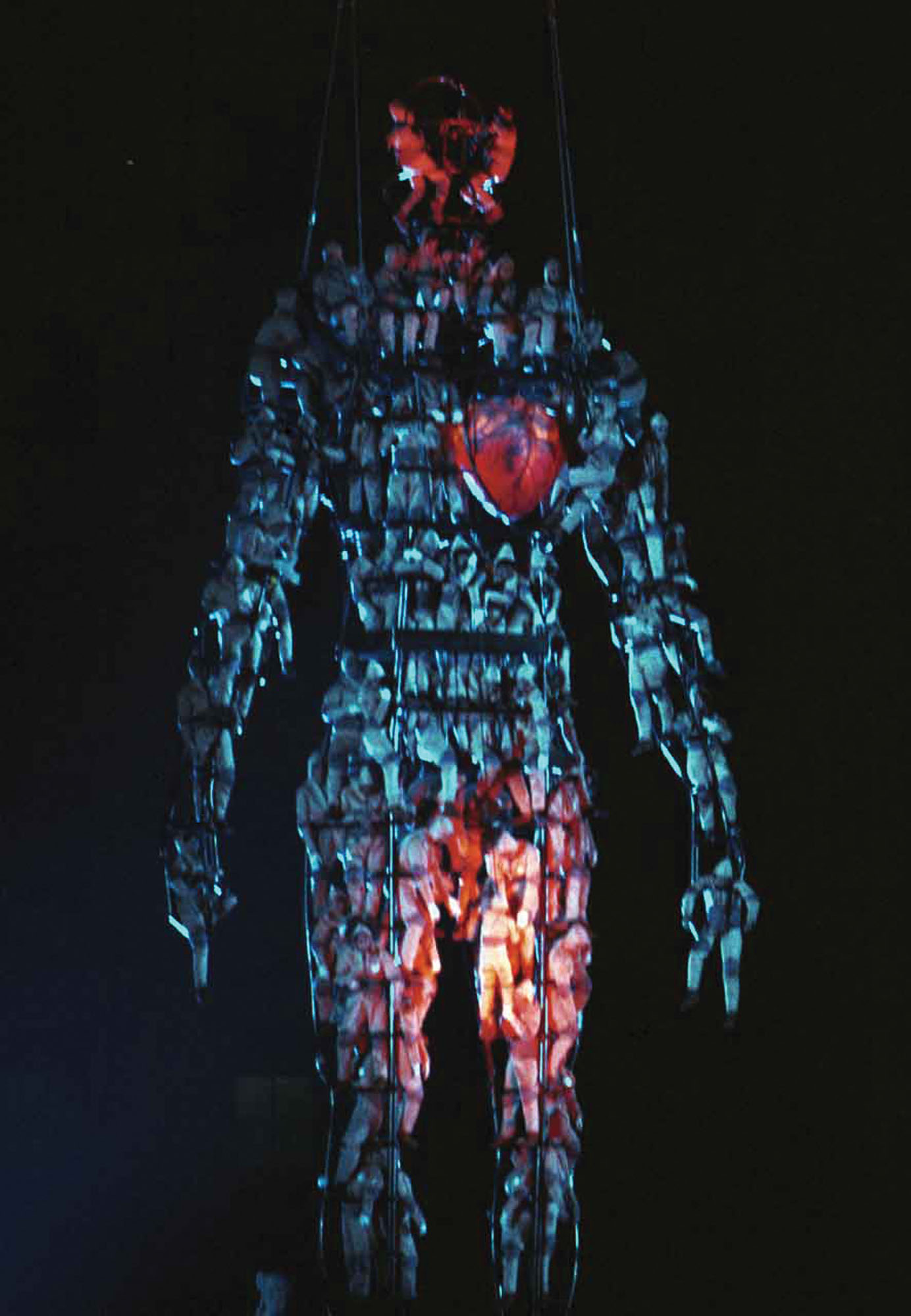 Según las fuentes de la organización, el gigante de 14,25 metros, se iría construyendo en base a los resultados dominantes de los deseos transmitidos en esa página web realizada ex profeso. De estructura metálica, iría tomando forma con las ideas del colectivo, lo que hoy denominamos «las tendencias». Paremos un momento. Volvamos la vista atrás y visualicemos al Maharal de Praga moldeando el barro con forma humana de su «golem». Sigamos. La idea final quedó en una mezcla andrógina. Véase ni macho ni hembra, caderas anchas, casi femeninas, sexo no definido, espaldas entre fuerte y flojas,… Una suerte de aquel viejo C3PO de Star Wars, pero sin gracia. Eso sí, con las ideas de la tolerancia, la sostenibilidad sostenible ecológica renovable limpia y reluciente, como la nueva mente del ser humano, que psicológicamente debía de ser femenina. Atentos a la explicación de Carlus Padrissa, uno de los directores de la Fura, y responsable del ritual… perdón, de la actuación.
