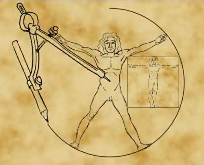 Ejemplo «elucubrador» de una transformación de símbolos y sus conceptos sería el paso del crismón, que significa «monograma de Cristo», que ya analizamos en la segunda parte de este trabajo, y que evolucionó a un círculo que englobaba múltiples mensajes, siendo el principal que Padre, Hijo y Espíritu Santo eran el principio y el fin de todo (Α y ω). Este símbolo lo relacionamos con el medievo. Fijemos la vista en el dibujo más famoso del Renacimiento, el «Hombre de Vitrubio«, de Leonardo da Vinci. Un hombre con las extremidades convertidas en aspas, que delimitan en movimientos superpuestos las dos figuras geométricas representadas alrededor de la humana. El círculo en representación del cielo, con brazos y piernas, abiertos y estirados, recuerdan un potro de tortura. El cuadrado, en cambio, asienta los pies firmes en el suelo, representando a la tierra, con los brazos aquí en posición horizontal, simulan un alfa y omega, donde el hombre pasa a ser el centro de todo. El Renacimiento lo convierte en el «ombligo/ónfalos» del mundo terrenal y el celestial, el «nuevo dios»; pero… ¿Quiénes promocionan ese concepto y para qué? Cambio de paradigma que vino para quedarse y evolucionar.