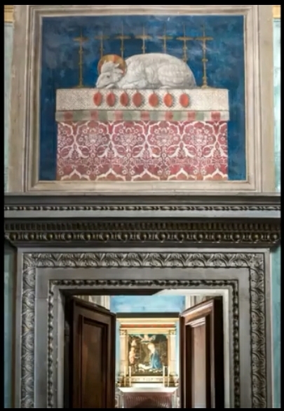 Sólo habría que fijar la vista en el cuadro de bienvenida colocado sobre la puerta de acceso a la cripta y pensar que hay tras ella. Se puede ver un altar con el cuerpo del Cordero custodiado por los 7 candelabros y los 7 sellos del Apocalipsis. Una advertencia al visitante de que está totalmente sellado para los espíritus profanos, seguido por la visión, al fondo, del altar con la réplica de «la Adoración del niño en el bosque» de Filippo Lippi, con una inquietante hacha clavada en una madera a la altura del cuerpo del pequeño Jesús. Los juegos de luces y fuegos iluminadores y ensombrecedores, a la vez, que se llegarían a producir en ese espacio hacen pensar en unas costumbres (extrañas, como poco) ya arraigadas en el seno de esos mecenas de arte y cultura. Cabe añadir que el culto a la epifanía de los Reyes Magos se celebraba, a modo de extraño desfile, en Florencia, donde participaba el pueblo con sus más altas personalidades al frente, desde finales del siglo anterior a esa fecha. Su origen fue una espontáneo cortejo de gente partiendo desde la Iglesia de San Marcos hasta el Baptisterio de San Juan, donde se le ofrecieron «presentes» a Jesús ante la pila bautismal y después se escenificó «la matanza de los inocentes» con niños falsos (faltaría más, ya eran otros tiempos ¿no?), suceso que se podría relacionar con una antigua ofrenda a dioses pretéritos «hambrientos de carne muy joven». El cortejo se escenificaba cada 3 años, en la fiesta de la Epifanía (invierno) y por San Juan (verano). Una celebración impulsada por los Medici; una revelación-epifanía del Hijo de Dios, por los impulsores de las revelaciones de Hermes, el dios del conocimiento oculto. Todo entre cortinillas, eso sí.