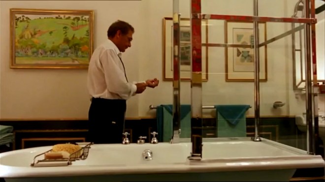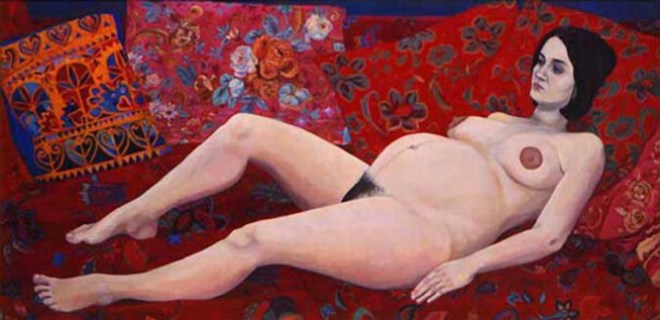 En el mismo cuarto de baño vemos un cuadro en el que vuelve a aparecer una mujer desnuda sobre un fondo rojo.”