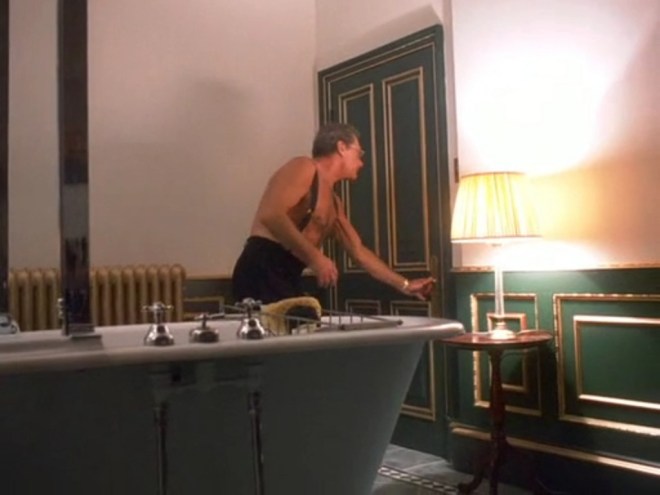 0340 Todo el azul que se ve en la escena sugiere eso, que lo que realmente ha pasado en la habitación ha sido un ritual de ahogamiento. La propia manta azul con la que está tapada la prostituta alude al símbolo de agua. El anillo con esa enorme perla plateada también hace alusión al mar, así como los dos demonios marinos ornamentales que hay en la chimenea.