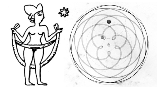 “Venus junto con una estrella de 8 puntas simboliza las 8 órbitas con la tierra que forman una flor en un ciclo pentagonal que empieza cuando sale Venus por el horizonte el 27 con la conjunción con la luna creciente y Júpiter se cierra un ciclo.