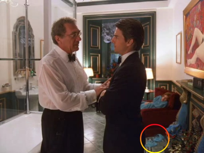 0280 “En un cuarto de baño del piso superior Bill encuentra a Víctor con la prostituta Mandy que ha perdido el conocimiento. La vemos en un sillón rojo en una postura que parece hacer alusión a la pirámide truncada. Este tipo de posturas extrañas siempre tienen significado en la obra de Kubrick.