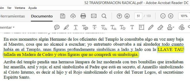 0567d “En esos momentos algún hermano de los oficiantes del templo le consultaba algo en voz muy baja al maestro, cosa que no alcance a escuchar; yo entretanto observaba a mi alrededor todo cuanto hacia en el templo, unas figuras profundamente simbólicas a lado y lado con la llave Tau tallada en madera de cedro y otras figuras que no comprendo su simbología.”