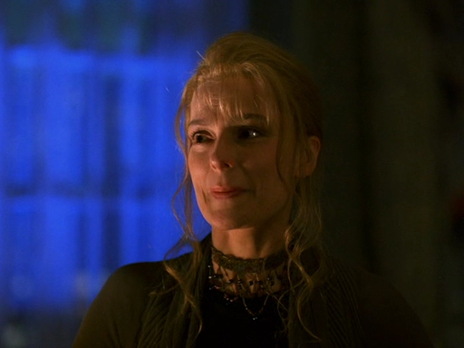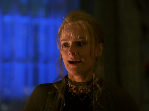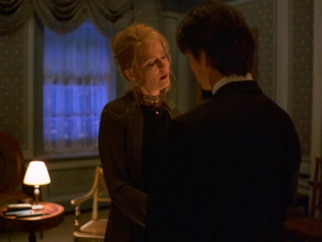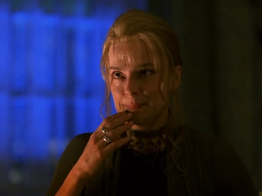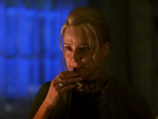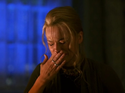 0537 En esta parte una desafiante señora Harford mira a su marido mientras se desahoga contándole algunos trapos sucios. Fijaros en lo que hay detrás de ella en la repisa unos DVDs o CDs de música en el lado izquierdo y unas cintas de video en el derecho.