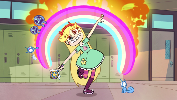 Vienen adoctrinando a los niños desde bien pequeños. Podemos ver un ejemplo en la serie Star donde una pequeña maga con diadema de cuernos demoníacos hace las delicias de los niños. Fíjense con que cara miran los pobres animales el antinatural arcoíris de 5 colores que dibuja en el aire.