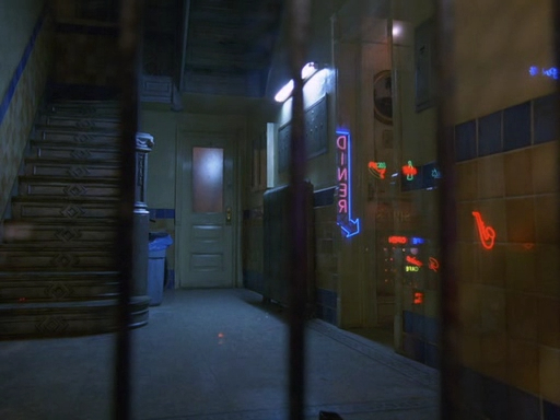 Entonces, Kubrick no está simplemente reutilizando el set. Ha dejado pistas obvias de que solo está parcialmente disfrazado. Y una de las más evidentes es que aquí podemos ver el reflejo del saxofón de Sonata Café y el cartel de Diner en la ventana. Aunque no vemos los nombres, estos símbolos de neón deberían ser familiares para el espectador, ya que los habíamos observado antes de que Bill ingresara al Sonata.