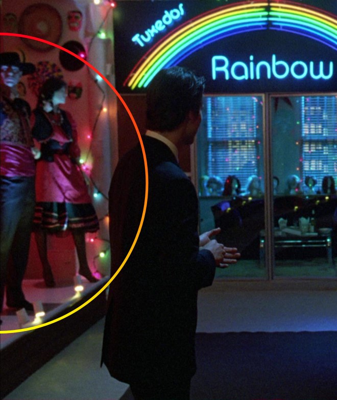 Kubrick ha destacado aquí estos letreros de neón para que el espectador pueda comenzar a darse cuenta de que Bill está recorriendo las mismas calles una y otra vez. Esto no es un error. No es pereza. No es porque estaba reutilizando el set y no podía permitirse el lujo de cambiar los letreros. Comprender verdaderamente esto exige que el espectador se acerque a Eyes Wide Shut con un ojo diferente. Kubrick está intentando sacar al espectador de la línea narrativa tradicional y hacerle consciente de que hay más cosas que hacer.”