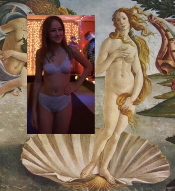 0888 En el caso de la hija de Millich no hace falta que el pelo le tape los atributos femeninos ya que tiene ropa interior. El pelo largo es un símbolo de ingenuidad y por ello muchas niñas se dejan el pelo largo hasta bien entrada la adolescencia. Estoy casi seguro de que a Kubrick le hubiera gustado mostrarla completamente desnuda pero como simulaba ser una menor de edad no quiso meterse en mas jardines. En ambos casos la pose dice que no tienen miedo a mostrar todos sus encantos para seguir seduciendo a la humanidad.