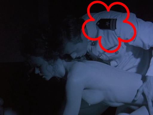 0891 La escena va subiendo de intensidad a lo largo de la película. Primero vemos a Alice de frente con relación al marine vestida. Y después va apareciendo mas desnuda y de espaldas. Al mismo tiempo la estrella de cinco puntas que lleva el militar en el galón la vemos primero en la posición en la que representa al hombre y después se invierte en forma de pentagrama satánico representando la cabeza del chivo.