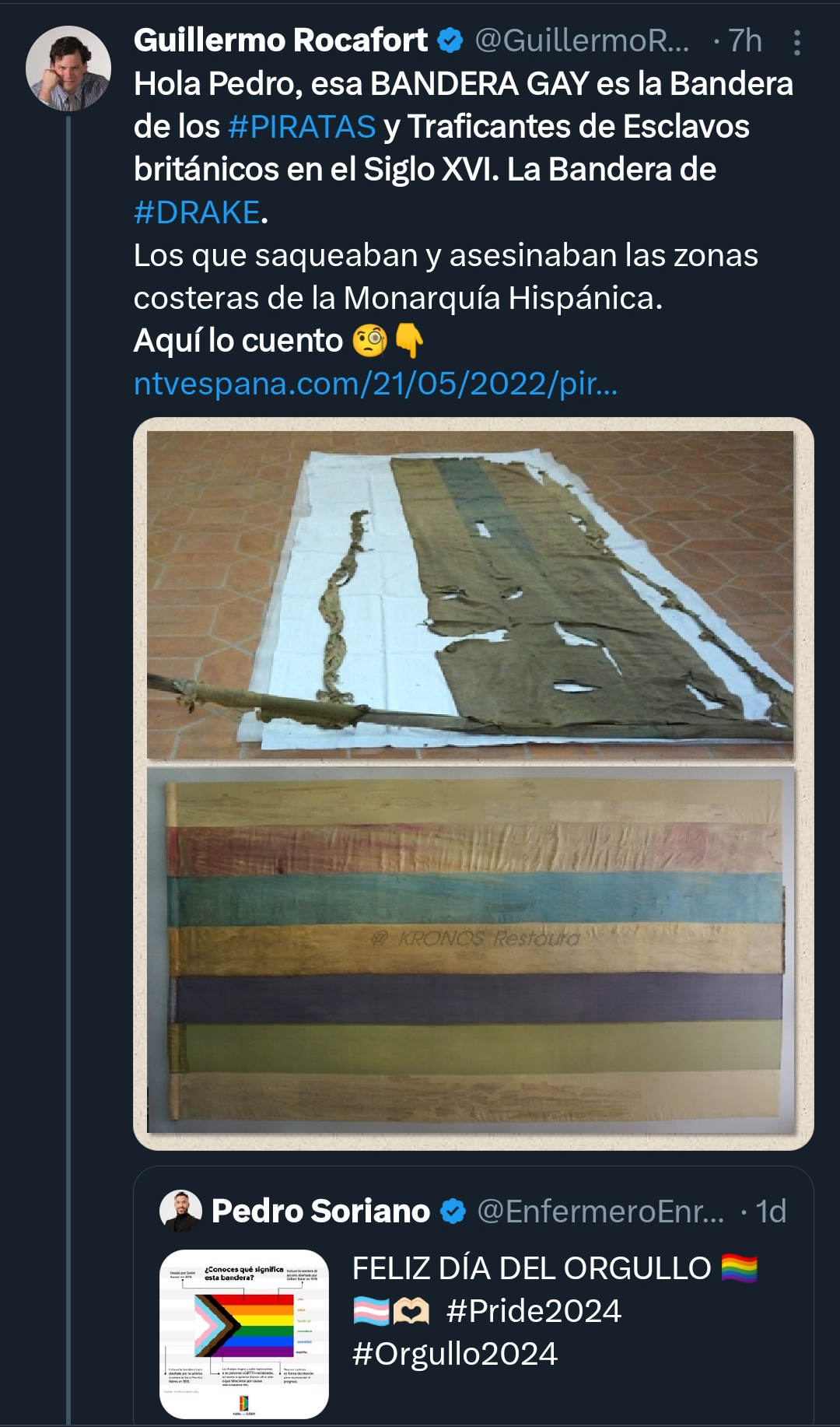 Guillermo Rocafort nos cuenta en un artículo que la bandera gay era la que lucían los piratas y más concretamente nos habla de la bandera que se encuentra en la capilla de la Catedral de Sigüenza y que fue arrebatada en Portugal por los españoles en 1589 al pirata inglés Sir Francis Drake.