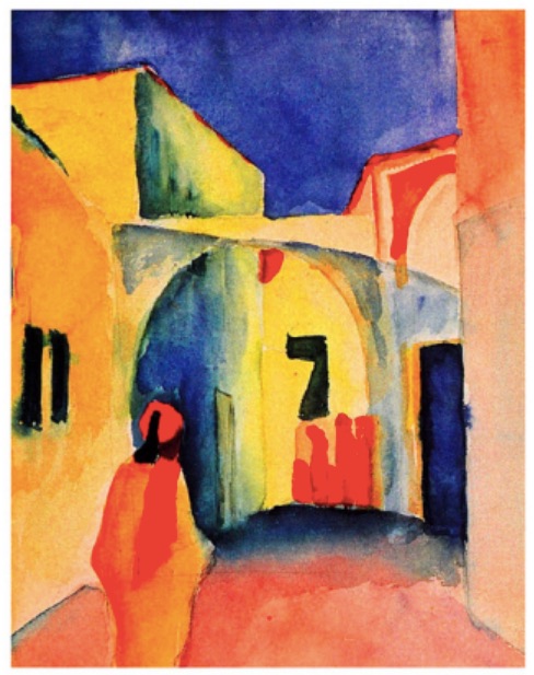 1295 El cuadro que nos muestra el «7» es de August Macke, uno de los líderes del grupo expresionista alemán, The Blue Rider. Ya tenemos de nuevo al azul de por medio. Se titula “Vista al callejón” y fue realizada en 1914, el año de la muerte del pintor en uno de los frentes de batalla de la primera guerra mundial.