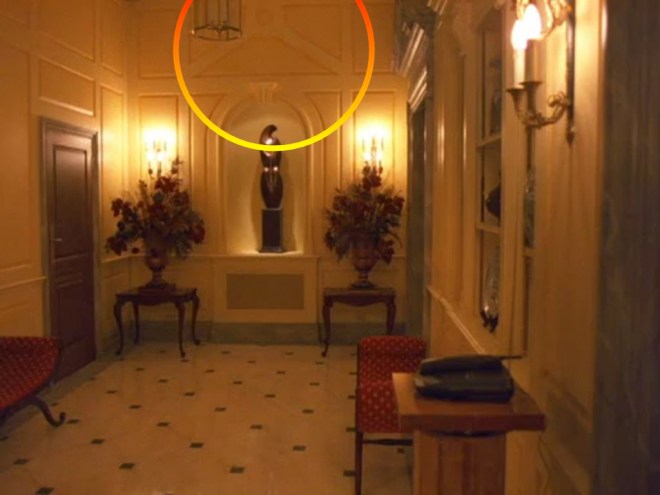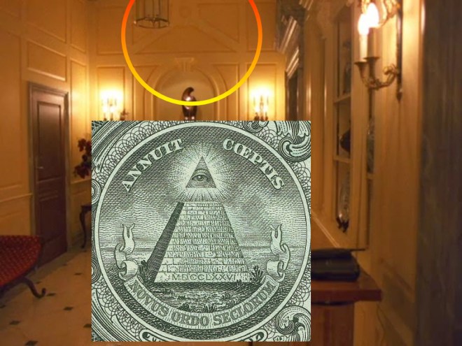 1297 Cuando Bill llama a casa de los Nathanson vemos un detalle que no habíamos apreciado antes porque Kubrick no mostró todo el trabajo de carpintería de la pared donde tienen ese ídolo africano del que hablamos. Ahora si podemos contemplar una pirámide truncada, sello de identidad del nuevo orden mundial, o podríamos llamarlo del nuevo orden secular.