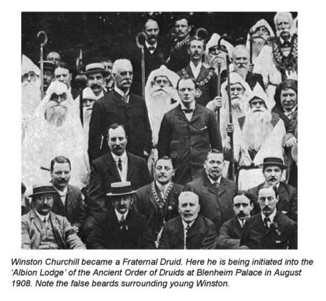 1345 “Winston Churchill se convirtió en un druida fraternal. Aquí está siendo iniciado en la “Logia Albion» de la antigua orden de druidas en el Palacio de Blenheim en agosto de 1908. Nótense las barbas postizas que rodean al joven Winston.”