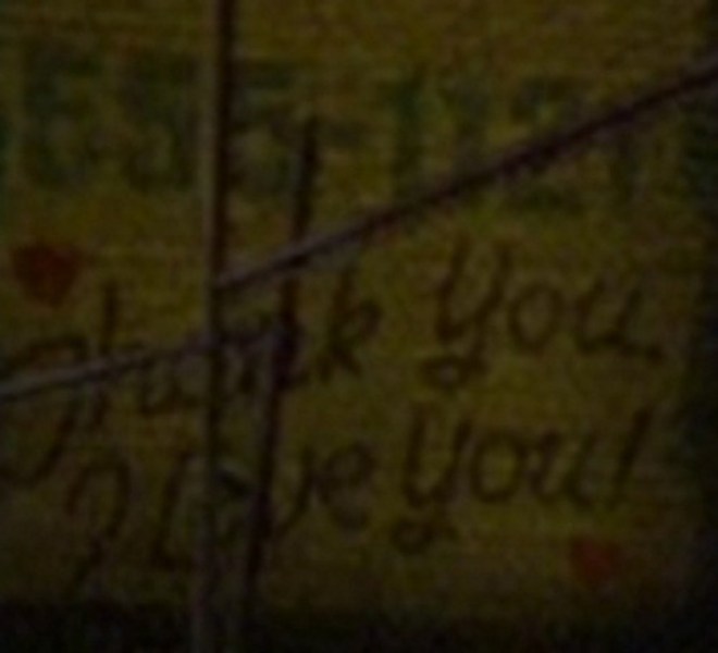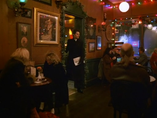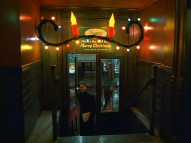 En cuanto a los árboles de navidad que se ven en esta escena, podemos ver tres, uno encendido junto al bajorrelieve de la rosa, otro apagado encima de un mostrador pero que por efecto de profundidad parece del mismo tamaño que el iluminado y uno muy pequeño en una tarjeta de navidad. El arbolito sin luces está junto a un cuadro con un 7.