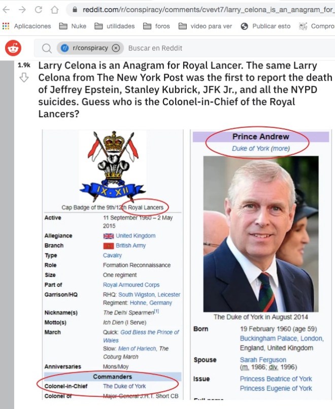 Pues desde la plataforma Reddit nos dicen que el nombre Larry Celona seria un anagrama del nombre Royal Lancer. ¿Y quién es el comandante en jefe de los lanceros reales? Ni más ni menos que el príncipe Andrés de Inglaterra que precisamente fue salpicado por el escándalo Epstein. Se demostró que el príncipe Andres había acudido a las fiestas pedofilas de Epstein y que incluso había pagado dinero a algunas de sus víctimas para que mantuviera el secreto.