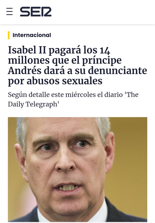 Una de las víctimas, Virginia Giuffre, aseguro que Epstein le obligó a mantener relaciones con el príncipe Andrés hasta en tres ocasiones siendo menor de edad. No se sabe a ciencia cierta a cuánto asciende el acuerdo legal para evitar que todo esto le haya causado tan solo el pago de una indemnización al segundo hijo de la reina de Inglaterra pero según el Daily Telegraph ha supuesto más de 14 millones de dólares. En el 2019 fue expulsado de la comandancia de los lanceros reales pasando al cargo el coronel Richard Charrington. Ese ha sido todo el castigo que ha sufrido por abusar de por lo menos una menor de edad. Los pederastas siguen en los más altos puestos de poder manteniendo una impunidad que resulta mortal en muchos casos.