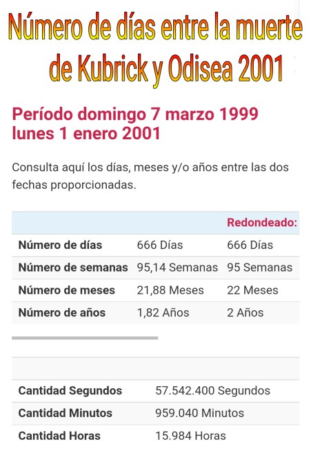 1682d Por otro lado ya sabéis aquello de dato mata relato y os voy a aportar un dato que os dejará con la boca abierta. Nunca sabremos si realmente fueron los Illuminatis los que asesinaron a este magnífico director o si le llego la hora, o si el mismo decidió hacerse desaparecer, pero una cosa sí está clara y es que oficialmente murió el 7 de marzo de 1999 y 666 días más tarde llego 2001…año clave en su película más famosa. No me digáis que la cosa no se asemeja a un espejo.