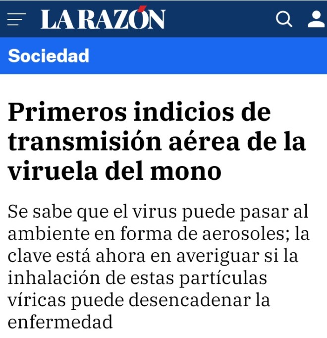 Se agita por primera vez la posibilidad de que el virus del mono se pueda transmitir no solo a través de fomites sino por el aire.
