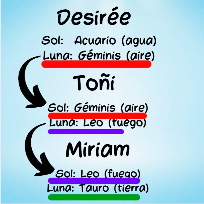 Desirée era Acuario con Luna en Géminis que es a su vez el signo solar de Toñi, quién tiene una luna en Leo que es el signo solar de Miriam, que a su vez tiene la Luna en Tauro (tierra), cerrando así con el elemento Tierra.