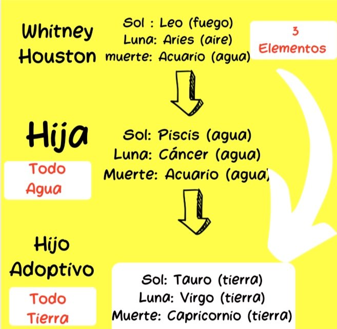 Whitney Houston era Leo (fuego), con luna en Aries (aire) y murió bajo el signo solar de acuario (agua). Por tanto, tenemos aquí los tres elementos. Sus hijos, en cambio son completamente de un elemento: agua (hija) y tierra (hijo adoptivo).