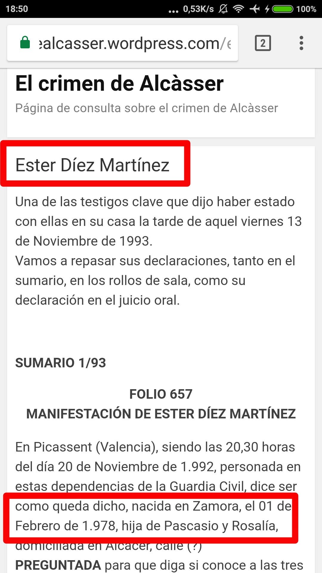 Declaración de Ester sobre Alcasser con las fechas de nacimiento de las niñas.