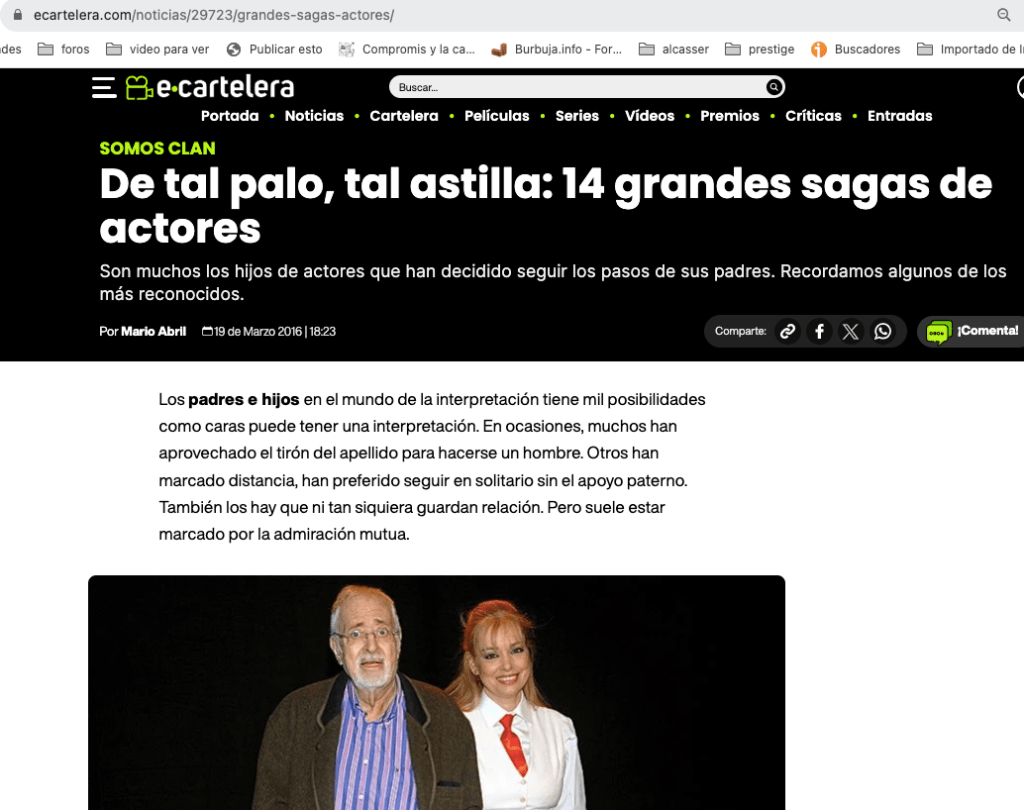 Como podemos leer en este artículo titulado «SOMOS CLAN De tal palo, tal astilla: 14 grandes sagas de actores» es bastante común entre la casta actoral continuar la tradición familiar y dedicarse a lo mismo que tu padre, tu abuelo y tu tatarabuelo…algunas castas de actores se pierden en la noche de los tiempos.