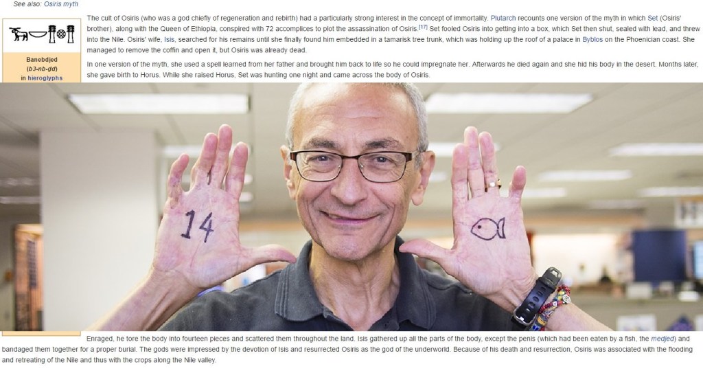 Vimos a John Podesta exhibiendo un 14 y un pez durante la campaña de Hillary Clinton antes de que saliera a la luz el escándalo Pizzagate. El pez alude al mito de Osiris que dice que el trozo 14, el falo de Osiris, fue el más difícil de localizar porque se lo tragó un pez.