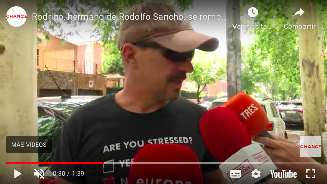 Rodrigo, hermano de Rodolfo Sancho habla con la prensa con una camiseta que dice que no está estresado mientras en el minuto 0:35 responde que están viviendo una pesadilla.