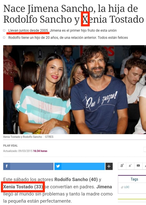 Curiosamente la actual pareja del actor se llama Xenia Tostado (volvemos a encontrarnos con uno de los pocos nombres que empiezan con X) y tuvieron una hija cuando ella tenía 33 años.