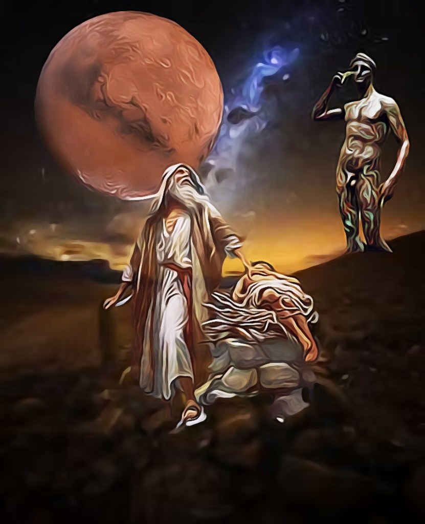 El símbolo-planeta Marte nos encajaría perfectamente en la siguiente Edad de Bronce o terceras, como dios guerrero en un mundo lleno de gentes interesadas sólo por la guerra y la soberbia. Aquí costaría de ubicar la figura de Abraham, personaje-fundador de las religiones monoteístas, pero su difícil localización en la historia se asemejaría al caso de esa misma terrible raza de guerreros.