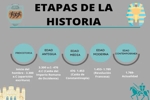 Fijémonos a grandes rasgos en la división en 5 etapas de la historia de la Humanidad en la actualidad: la Prehistoria, desde la aparición del hombre hasta los primeros escritos hacia el 3300 antes de Cristo; la Edad Antigua, hasta la caída del Imperio Romano de Occidente en el 476 de nuestra era; la Edad Media, hasta la desaparición del Imperio Bizantino (o Romano de Oriente) en el 1453; la Edad Moderna hasta la Revolución Francesa en el 1789; y la Edad Contemporánea, hasta nuestros días (con el permiso de los «acuarianos»).