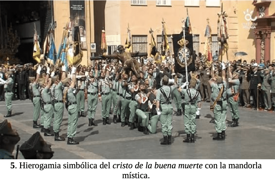 «Evidentemente, estamos ante una hierogamia-sacrificio, esto es, ante una cópula simbólica del dios y de la diosa, que es, al mismo tiempo, el sacrificio del dios, y en cierto sentido, su enterramiento, es decir, su descenso a los infiernos. La cruz representa el elemento masculino, convexo, fálico, y el estandarte el femenino, cóncavo, vaginal-matricial. Todo esto permite entender por qué a este cristo se le llama de la buena muerte… Incluso, por qué el lema de la legión es «¡viva la muerte!».