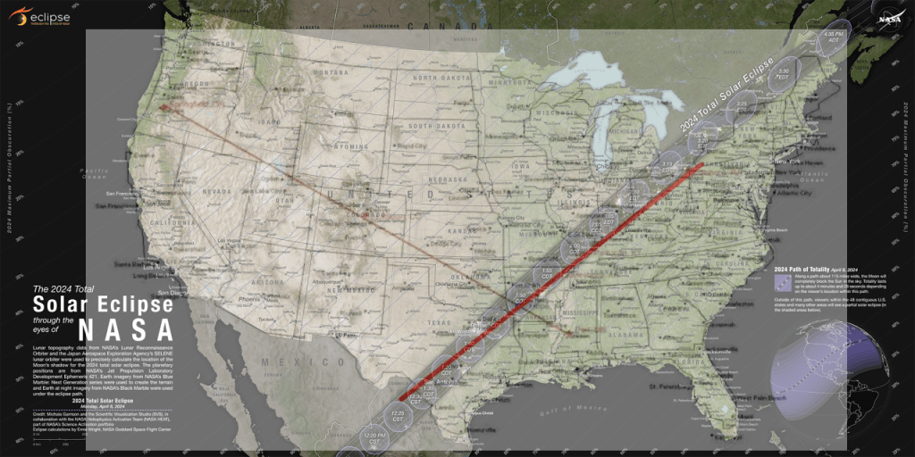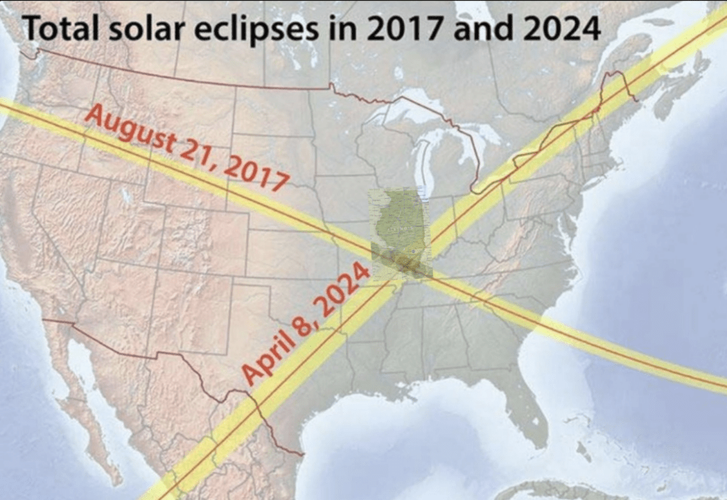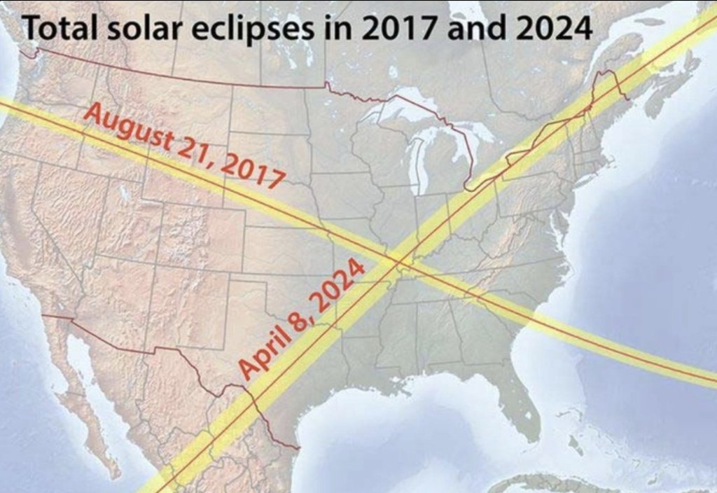 Otro tuitero, Josh Stylman @jstylman nos aporta otros datos importantes en referencia las fechas de los dos últimos grandes eclipses que han ocurrido en USA, el del 21 de agosto de 2017 y este del próximo 8 de abril de 2024 que como ven forman una gran X.