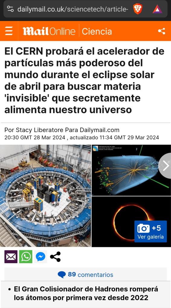 Pero no solo la NASA hará su espectáculo ese dia, el CERN se encenderá por primera vez desde hace dos años. Precisamente para el dia del eclipse tienen preparado un experimento para buscar la «materia oscura». Arrancaron precisamente el acelerador durante el equinoccio de primavera en marzo.