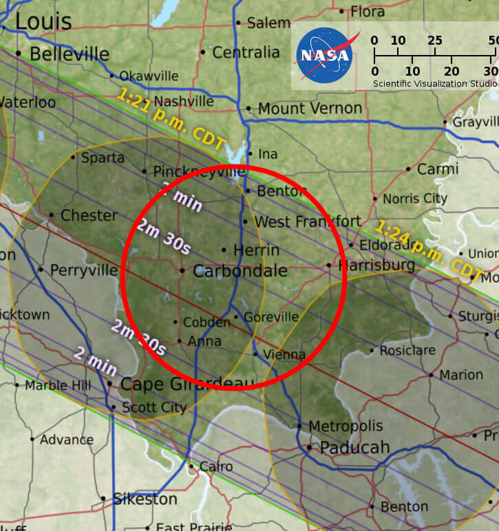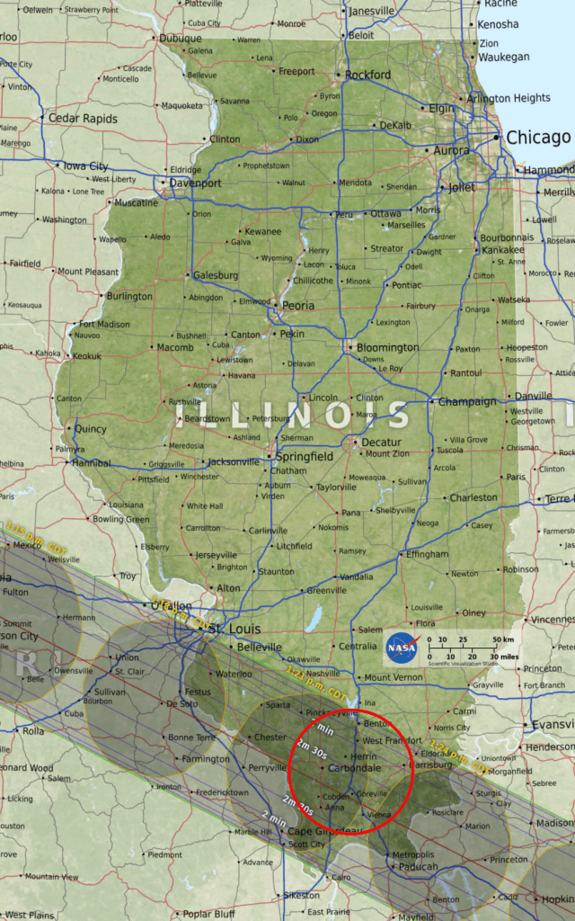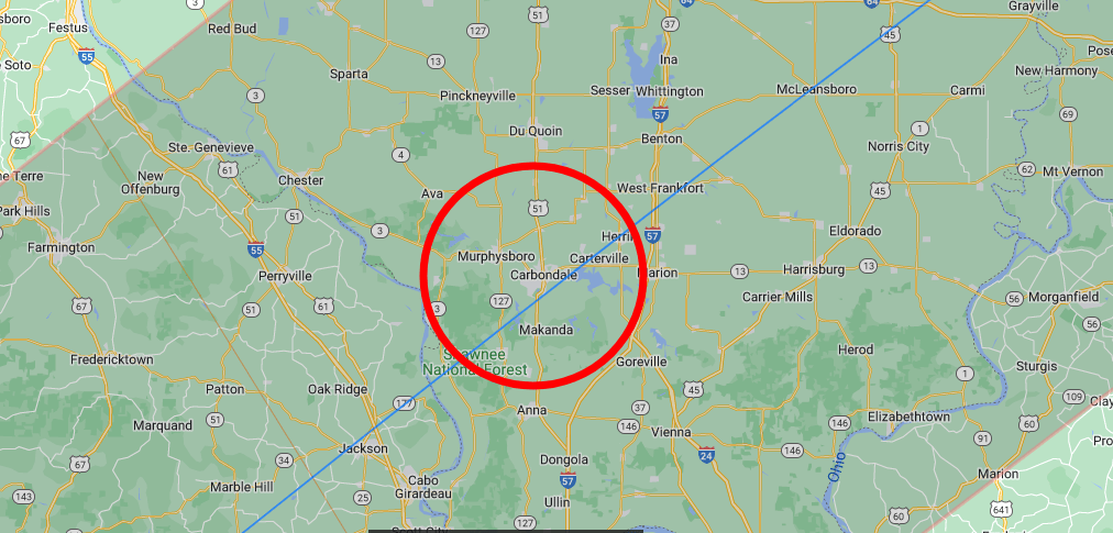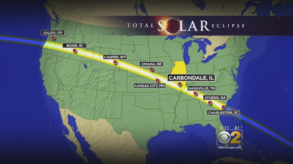 «A continuación, el punto de intersección donde ocurrirán el último eclipse y este es una ciudad llamada Carbondale, IL. El carbono tiene 6 protones, 6 electrones y 6 neutrones. También vale la pena mencionar que a Carbondale a menudo se le conoce como el Pequeño Egipto.»