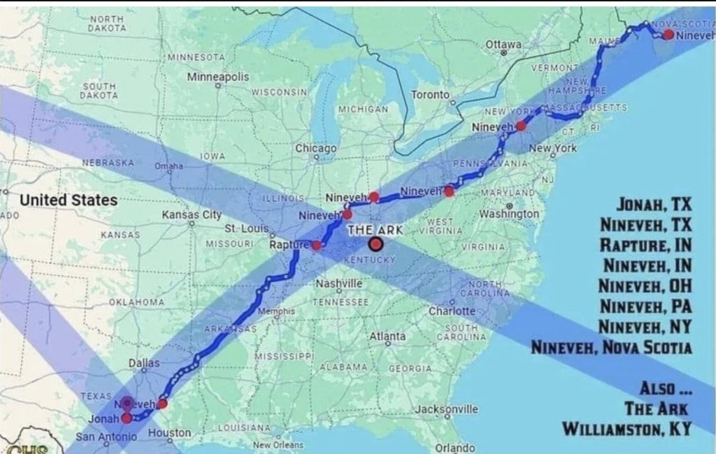 «Sin embargo, se vuelve más surrealista… si sigues el camino del eclipse, también cruza directamente 7 ciudades llamadas Nínive (sin mencionar Jonah, TX, Rapture, IN y The Ark en KY). No estoy muy versado en las Escrituras, sin embargo, encontré este pasaje clave.»