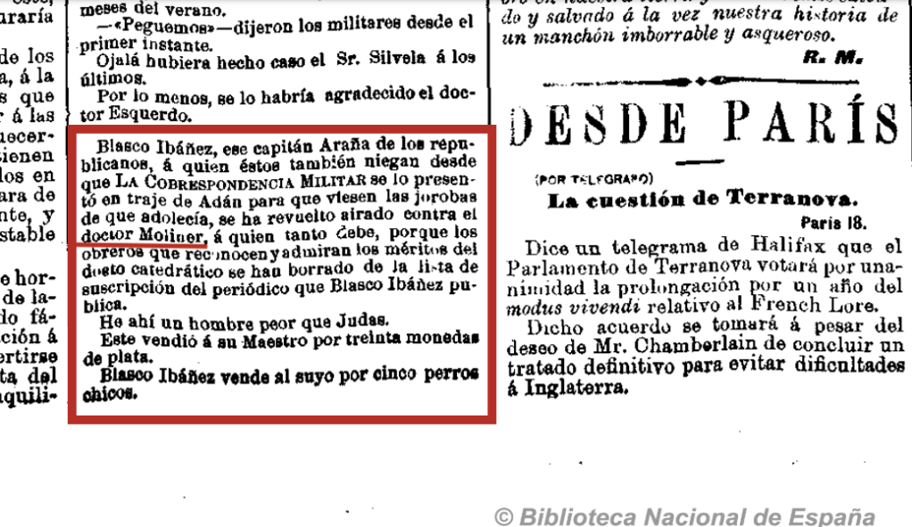 Blasco Ibáñez ya tuvo sus desaires con el Dr Moliner, al cual los masones adulan y cuya estatua estaba muy cerca del ficus donde de la Alameda, y eso fue publicitado por el periódico La Correspondencia militar cuyo director, el sr Fernández Arias fue retado en duelo también.