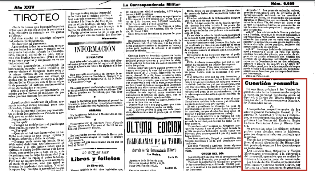 “En una finca próxima á las Ventas ha quedado esta tarde honrosamente zanjada la cuestión personal pendiente entre el diputado á Cortes Sr. Blasco Ibáñez y el director de La Correspondencia militar, Sr. Fernández Arias. Acompañados respectivamente de los señores general Fernández Bernal y Figueroa, y Vinaixa y Estebanez, se encontraron esta tarde en una finca próxima á las Ventas del Espíritu Santo los Sres. Fernández Arias y Blasco Ibáñez. Se proponían estos dos últimos señores probar unas pistolas, como lo hicieron, pero por desgracia hubo un incidente que lamentar. Uno de los proyectiles disparados se alojó en el muslo derecho del Sr. Blasco Ibáñez, poniendo término á los ejercicios que se realizaban. Los doctores Sres. Mitjavilla y Verdes Montenegro procedieron á la extracción del proyectil, operación que se realizó felizmente a la media hora de comenzada. La herida del Sr. Blasco, cuyo proceder caballeroso y correcto merece elogios, por fortuna no ofrece caracteres de gravedad.”