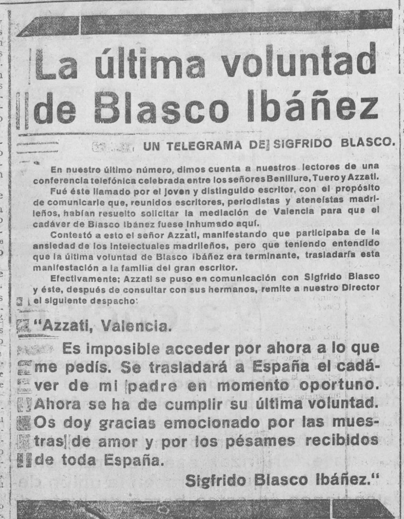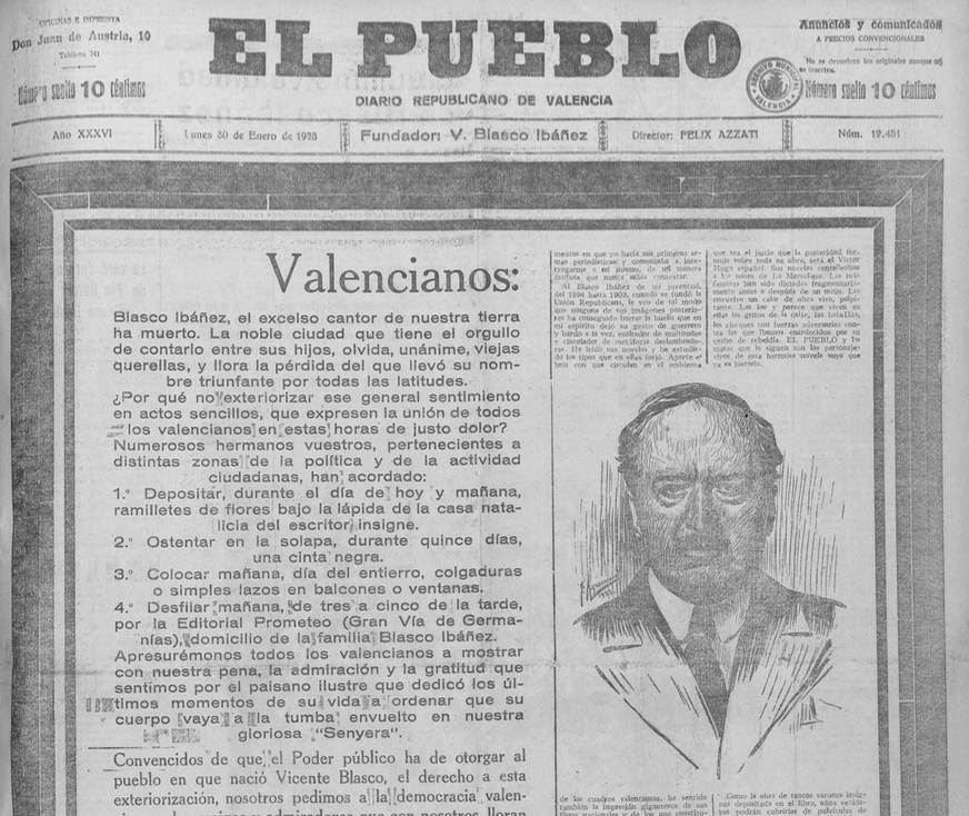 A nosotros no nos molestan las críticas en esta hora de dolor. Prueban además la fortaleza de corazón de los que reaccionan contra la estupidez de miles y miles de españoles y extranjeros que lloran la muerte del gran valenciano. Baroja y Valle Inclán, con su desenfado falsamente juvenil (no es joven quien quiere, sino quién puede) ponen una fea nota «clownesca» en medio del dolor general. Ellos no se enteran, по han querido enterarse que nosotros lloramos a don Vicente Blasco Ibáñez, al creador de Valencia, hecha a su imagen y semejanza al Gran Capitán de los ejércitos republicanos, al que en horas de angustia mientras esos «principes» de la escala zoológica de ambolaban su hipocondría, uno insultando desde las butacas de un teatro a una ilustre mujer y otro dando opiniones en revistas deportivas -abandonó su retiro de paz para poner su pluma y su corazón al servicio de una gran causa.”