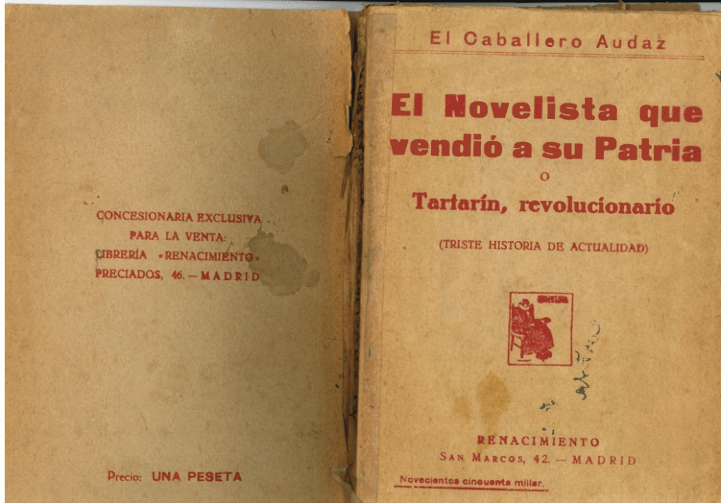 “El novelista que vendió a su patria: o, Tartarin, revolucionario (una triste historia de actualidad)” escrito en 1924 bajo el seudónimo del caballero audaz fue una de las obras de Carretero Novillo que si vamos a su pagina en la wikipedia no nos aparecerán. Pero si lo harán todas las novelas eróticas que escribió para ganar dinero, incluso nos avisan de que entrevistó a Vicente Blasco Ibáñez.