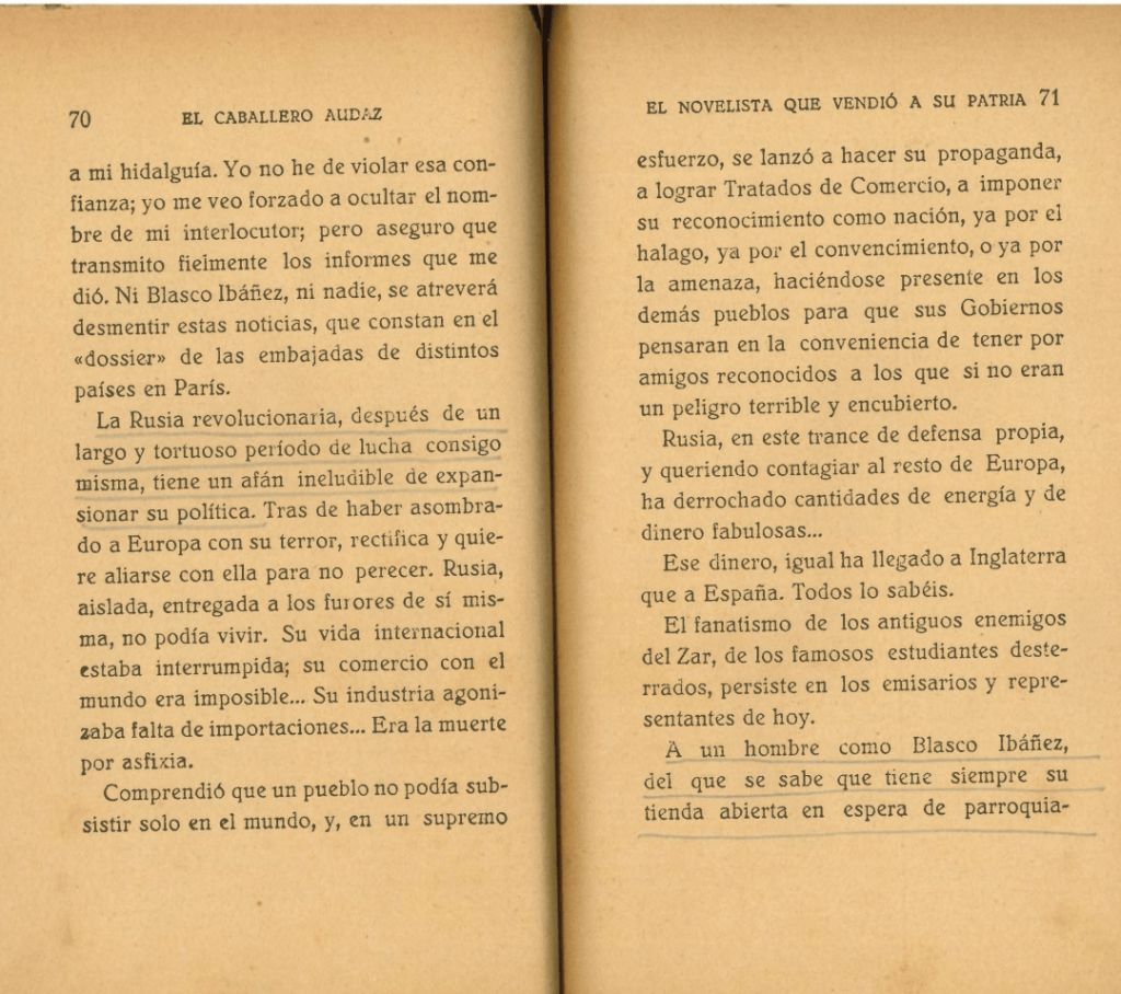 Parece que “el caballero audaz”, ese gigantón de metro noventa de estatura y conocido espadachín, aseguraba que la Rusia soviética había cedido al escritor valenciano un millón de francos para su tarea de acoso a la monarquía. A este periodista se le atribuyen los bulos derrotistas que circularon por Madrid en el 36.
