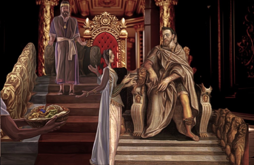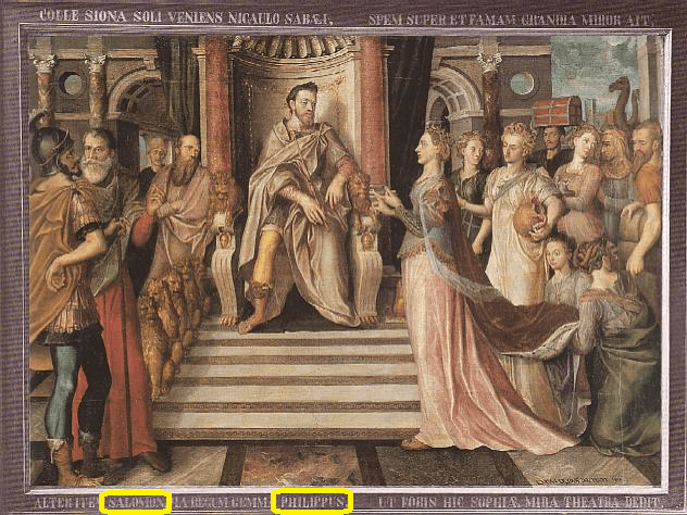 El discurso fue recogido por cortesanos españoles. Su fuente se recoge en concreto en el Paralipómenos 22, 6-19: «Dios había escogido a Salomón, el hombre de paz, para edificar su Templo prefiriéndolo a su belicoso padre, el rey David.» El Emperador Carlos, de hecho, se hizo grabar la escena de la lucha con David y Goliat en una de sus más famosas armaduras. El «salomonismo» no fue un concepto nuevo exclusivo en la figura de Felipe, sino que tuvo su origen en el Renacimiento italiano y aprovechada por la propaganda imperial. Esta relación de David, el guerrero, y Salomón, el sabio y pacificador, con Carlos V y Felipe II es muy conocida en la historia. No así lo que vamos a analizar.