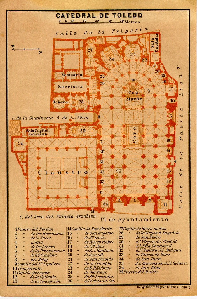 El primer trazado de las obras corrió a cargo de un misterioso personaje, al parecer de origen francés, al que se le menciona como «Maestro Martín«, descubierto en unos documentos eclesiásticos a mediados del siglo pasado. El maestro posterior a este, Petrus Petri (o Pedro Picapiedra), de origen español, y también conocido como Pedro Pérez, que parece ser el responsable de la Capilla de la Santa Cruz de esa catedral, que albergó enseguida los restos de Alfonso VII y Sancho III, lo que más tarde se conocería como la Capilla de los Reyes Viejos, antes mencionada. Los últimos retoques fueron llevados a cabo por los maestros de la familia de origen flamenco, Egas Cueman, con apellidos y nombres castellanizados como los de Hanequín de Bruselas (hoy podría conocerse como el niño de la Jéinequen), que acaba con la Puerta de los Leones de esa catedral, finalizada por su sobrino Enrique Egas, que luego inició las obras de la Capilla Real de Granada. El coro se concibió desde un principio para que estuviera situado en medio de la nave central, sumado a la capilla Mayor define el núcleo religioso de todo el conjunto monumental. La caja de resonancia que acompaña a las liturgias religiosas actuaría con unas vibraciones considerables dentro de aquellas 5 naves, sostenidas por 88 columnas y afinadas por las 72 bóvedas.