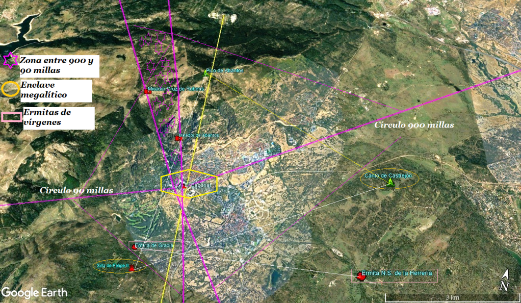 Se comenzó a tomar en serio un lugar al Sur del monte Abantos, distante a 90 millas inglesas de los restos del Emperador y a 900 millas, exacto 10 veces más la distancia al gran cenotafio de los Habsburgo que se estaba concluyendo, que fray José de Sigüenza, cronista oficial del Real Sitio, narraba con precisión: «en la ladera de esta sierra, junto a una pequeña población que se llama El Escorial, se descubrió una llanura o plaza suficiente para una grande planta. El puesto a mediodía (al Sur), que para estas tierras frías, como lo son estas sierras, es de mucha consideración. Guardadas las espaldas con el mismo monte de los cierzos fríos, mas refréscanla y tienen sana en verano.» *Puntualizar que aunque las millas inglesas como las conocemos actualmente se establecieron unas tres décadas más tarde del inicio de las obras del Real Monasterio (1593), hemos escogido dicha mesura por obtenerse una cifra más redonda que las 978 y 97,8 millas romanas, ya casi en desuso en esa época, o los 1448 y 144,8 kilómetros y su equivalencia en millas náuticas, que aunque posteriores, son medidas naturales obtenidas de la medición del planeta y pueden proporcionar un sentido más «lógico» a los valores expresados en algunas de estas curiosas «calibraciones».