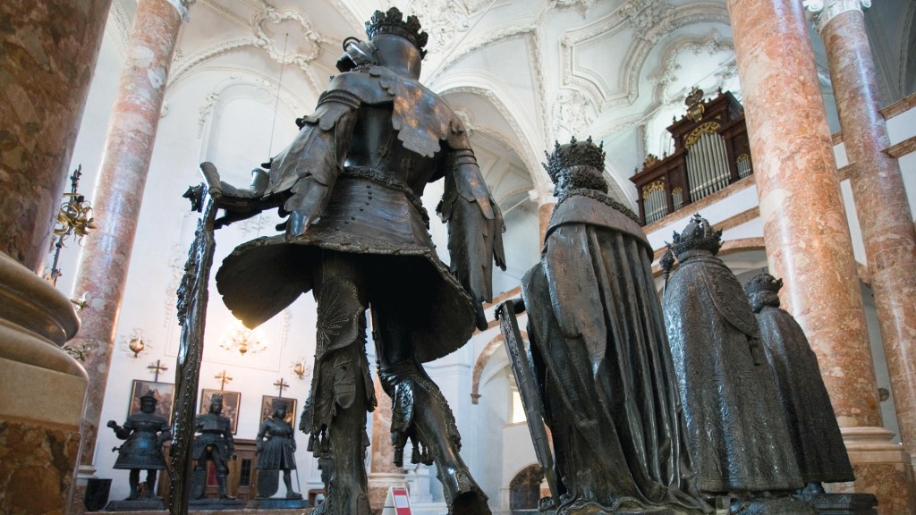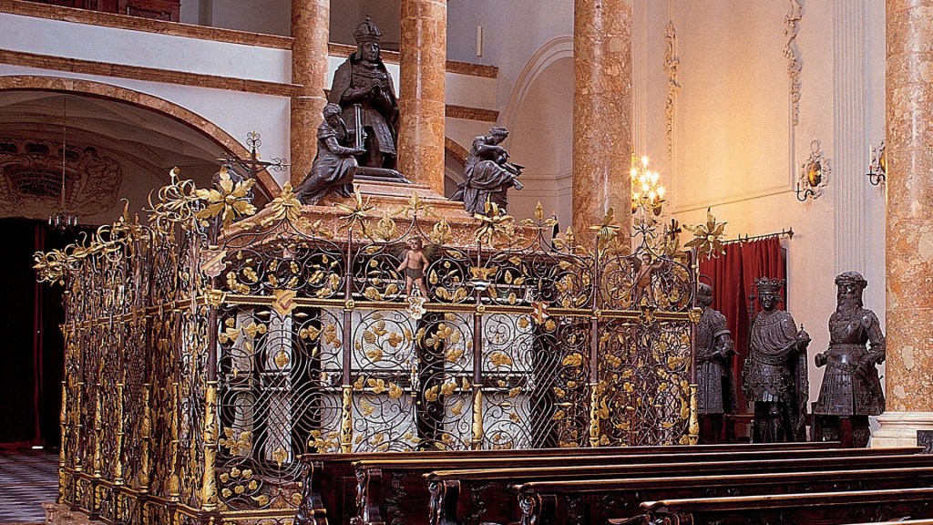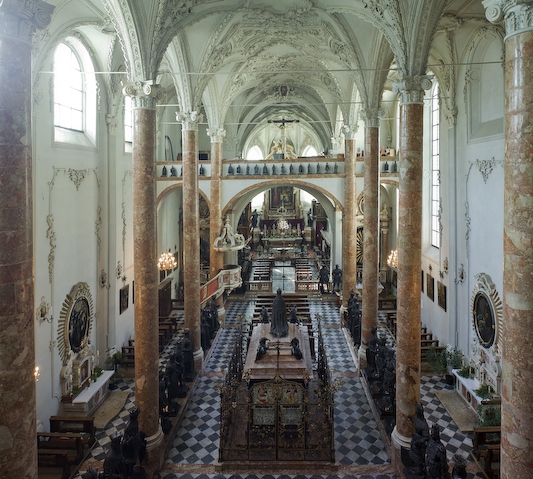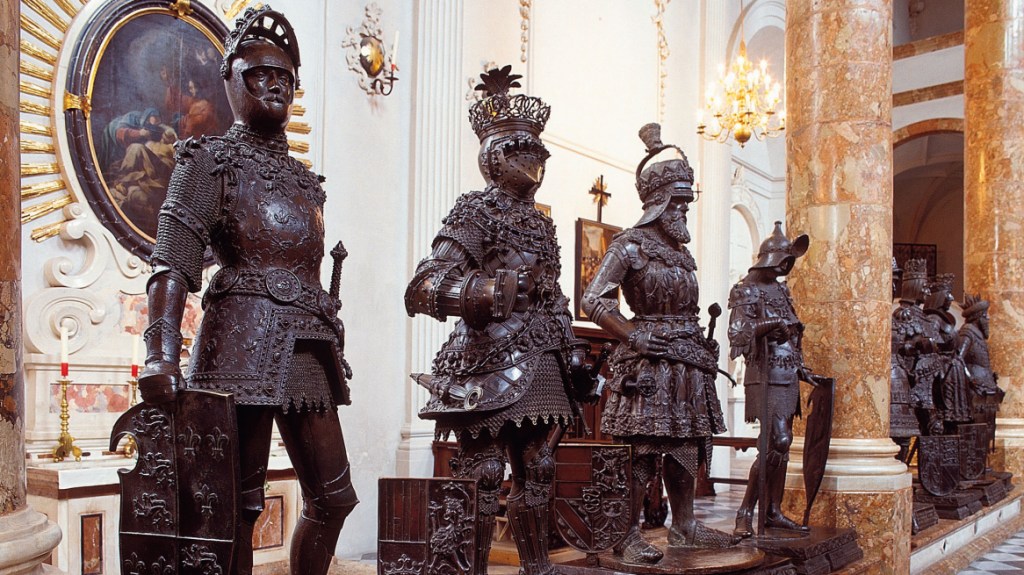 El proyecto comenzó a esculpirse desde 1502, implicando a los mejores artistas, encabezados por el gran Alberto Durero (Albrecht Dürer, en su pueblo). Muerto Maximiliano en 1519, se continúan elaborando las estatuas y su nieto y futuro emperador, Fernando I, establece el lugar del templo en Innsbruck, la capital del Tirol, construyendo la Hofkirche (Iglesia de la Corte), entre 1553 y 1563, aunque las últimas estatuas no se acabaron hasta 1555. Su cenotafio (tumba sin cuerpo) se alzaba en el centro, con Maximiliano I arrodillado, orante, y humilde, como nunca lo fue, y acompañado por las cuatro virtudes cardinales: la justicia, la templanza, la fortaleza y la sabiduría, de las que hizo gala en escasísimas ocasiones, rodeado por 28 de las 40 enormes estatuas de bronce proyectadas en un principio (28, como los casetones del panteón de Agripa, curioso), que no fueron doradas y se las conoció como los Schwarze Mander (hombres de negro). Custodios representantes de su familia y de lo más granado de la nobleza europea que se habían unido casi como una hierogamia, pues se creían elegidos por Dios, fueron allí plasmados: Fernando, el Católico, su hija Juana, la Loca, y el hijo de Maximiliano, Felipe, el Hermoso; así como el comandante de la primera cruzada y protector del Santo Sepulcro, Godofredo de Boullón, Clodoveo I, primer rey de los francos y convertido al cristianismo, Teodorico, el Grande, o el mismísimo rey Arturo de las leyendas del Grial. Todos rodeando la monumental reja de hierro que custodiaba al Emperador de la cristiandad. Este último complemento fue añadido en 1584.